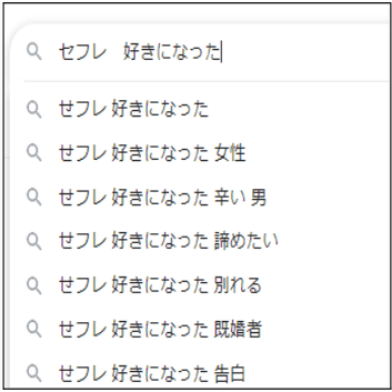 そこで、セフレと別れられない人に大して記事を書いていきます。柱となるキーワードはgoogleで「セフレ」と打ち込んで出てきた予測変換を参考にします。