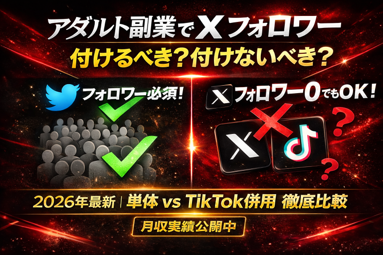 ⇩動画で観たい方はこちら ヤマト発信情報 こんにちは、ヤマトです。 アダルト副業に興味を持ってくれたあなた、本当にありがとうございます。この記事では「アダルト副業でX(旧Twitter)を活用するなら、フォロワーを付けるべきか、付けないべきか」をテーマに、包み隠さず全部お話しします。 私はこれまでアダルトアフィリエイトをX単体で運用したり、TikTokやインスタと併用したりして、実際に毎月安定した […]